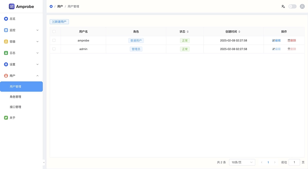 用户查看、新建、编辑、删除(admin 管理用户禁止编辑)